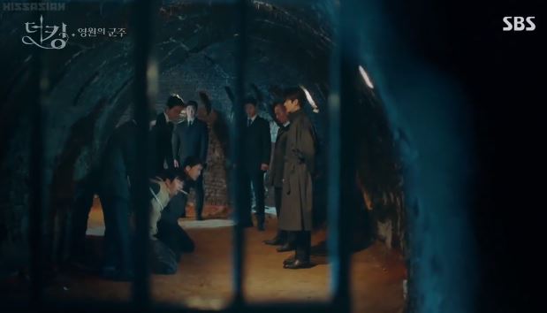 Lee Gon goes to the palace dungeons and questions both Lee Sang Do and Kim Gi Hwan (the restaurant owner). Lee gon states that he is asking them so that lives can be saved and not because he doesn’t know. He asks if they know about Eosu bookstore. He says the one who answers first will live and the other person will be beheaded.