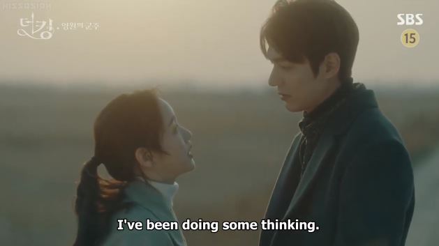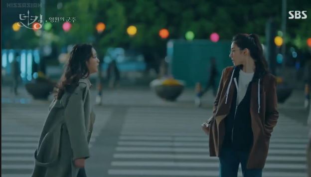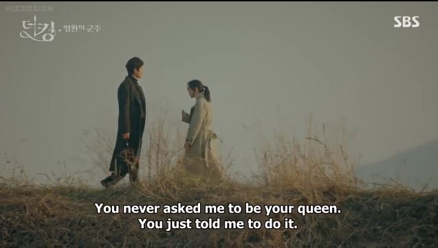 Tae Eul says he didn’t wear it for her. He says he was in a hurry but says it was the best thing he had done since he came to this world. Lee Gon says he is waiting for her answer and says the story about Koo was a joke. Tae Eul says that wasn’t a proposal. She says he didn’t ask her to be his queen but just told her to do it. Lee Gon stops walking and asks her what is her answer.