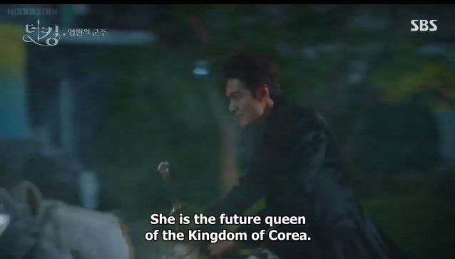 Lee Gon commands the cavalry, “Protect her! She is the future Queen of the Kingdom of Corea!” Lee Gon draws out his sword. The cavalry follows suit.