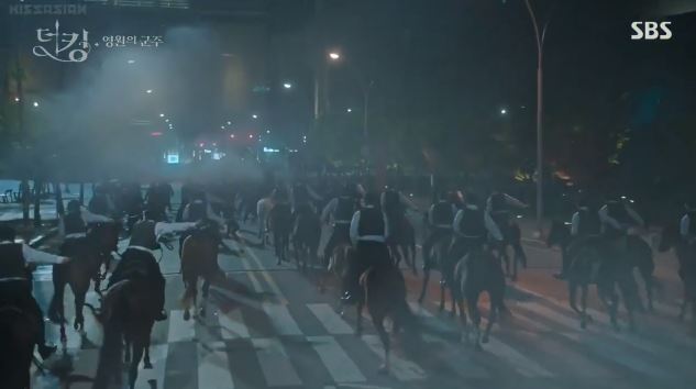 Tae Eul hears the sound of horse hoofs approaching her. She looks up to see Lee Gon and the cavalry riding down the street.