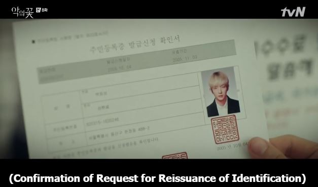 She then asks for his parent’s names. He gives her Hee Sung’s parents name. He also confirms his residential address. She says she will give him the confirmation request for re-issuance. She hands him the confirmation slip of the request for Re-issuance of Identification. Do Hyun Su looks at Hee Sung’s name beside his own photo in the slip.