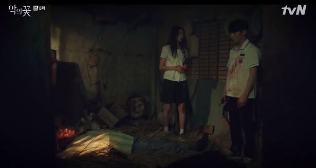Do Hyun Su grabs the murder weapon from her. He smears the blood on himself and his clothes. Hae Su says this is wrong and he shouldn’t do this. She asks him to give the murder weapon to her.