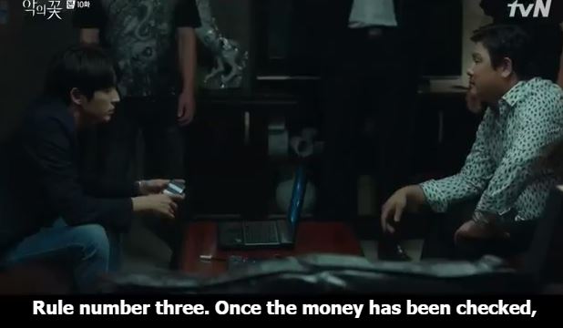 At the agency, Yeom tells Hyun Su, “Rule 1. You are not to carry any communications devices when meeting or carrying out our deal. Rule number 2. I will first check the money. Rule 3. Once the money has been checked, you will collect your package at the designated location. The photo of the accomplice will be given once I receive the money.”Hyun Su nods.