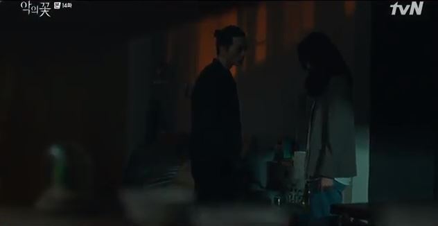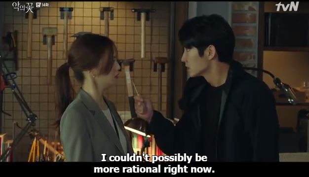 At the workshop, Hyun Su holds the knife against Ji-won’s neck and says he won’t trust anybody from now on. He tells her to raise her hands slowly. She tells him not to do this as it will get him nowhere.