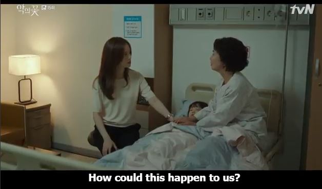 At the hospital, Eun ha sleeps beside her grandmother. Ji-won’s mother tells Ji-won to stay here and not leave. She says it is all because of Hee Sung (Hyun Su). She says he deceived Ji-won and this is happening because of him. She says she resents him.