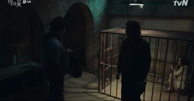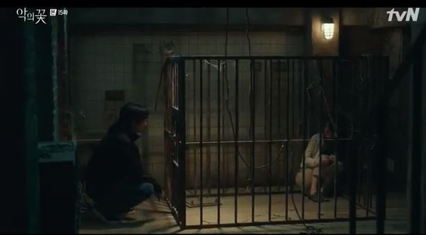 Hee Sung sits beside the cage and tells Jung Mi sook that she can never get away from him no matter how hard she tries. He says that is her fate. Jung Mi Sook trembles as she looks over his shoulder.