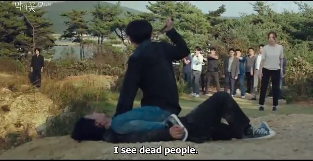 Hee Sung runs to the edge of the cliff. Hyun su follows him. Hee Sung stops and turns around. He punches Hyun Su and Hyun Su grabs him. Hyun Su pushes him to the edge of the cliff. Hee Sung loses his footing and falls on the ground. Hyun Su straddles him.