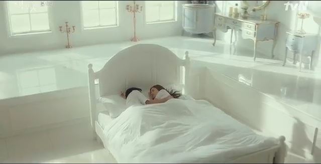 The scene shifts to Ji-won and Hyun Su clad in white and lying in a white bed. Everything surrounding her is white. The sea is seen outside the window.
