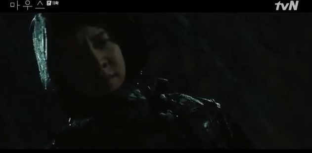 Bong Yi is about to faint. She looks up at a black figure who is holding a wrench (same one that Ba-reum had with him). She puts her hand over his shoes and says, “Please take Yu Na, please save her.”