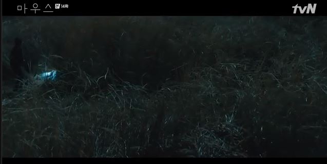 Mu Chi flashes his torchlight across the field and starts searching. Ba-reum makes a run for it and Mu Chi chases him. At one point Mu Chi loses him. Ba-reum crouches in the grass, hidden from sight. Mu Chi calls out to him saying that this doesn’t justify the killing and he is still a psychopath. He tells him to show himself.