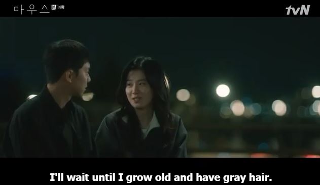 Bong Yi smiles as she says she will wait. He says it may take a long time. She says she will wait till she grows old and has grey hair. She says he shouldn’t reject her because she is old.