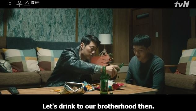 After he hangs up. Mu Chi turns up at his doorstep with drinks. Mu Chi says Ba-reum cared for Mu Won. Ba-reum says Mu Won cared a lot for Mu Chi.