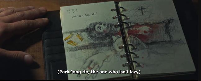 We see a montage of Ba-reum committing the Moojin Serial Killings. He makes a diary entry for each of the murders and he draws out a sketch of the dead body.