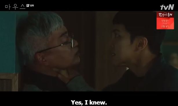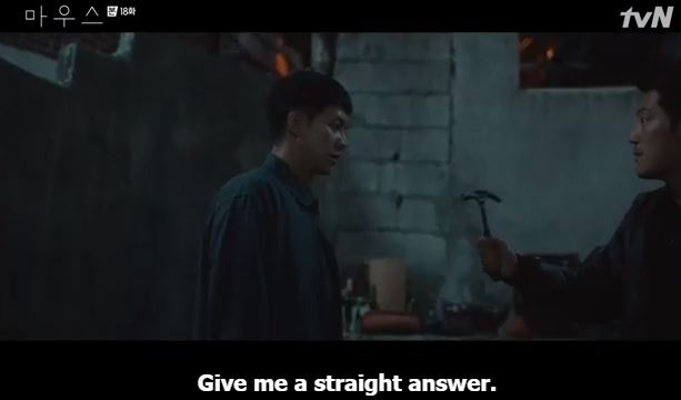 Mu Chi holds out a hammer. He asks if Ba-reum was supposed to meet Lee here. He says he will kill Ba-reum and go to jail if he doesn’t answer. He says there was no one on the CCTV recording in the evidence room because Ba-reum was the killer. he asks if Ba-reum killed Bong Yi’s granny too. Ba-reum is silent. Mu Chi presses on.