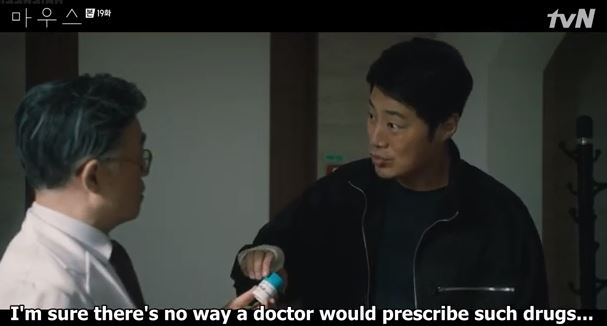 At the precinct, Mu Chi recognises the pillbox as Ba-reum’s. The doctor says the bottle is labelled as a painkiller but tablets inside block serotonin production. He says serotonin is a hormone that suppresses our violent nature. He says low serotonin brings out the violent nature.