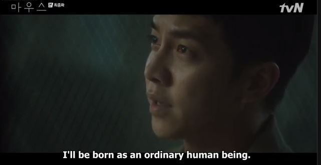 Ba-reum sits next to his younger self and says that the almighty finally heard his prayers. He says, “You are no longer a monster.” Ba-reum hugs his younger self and tears streak down both their faces.