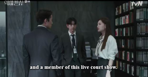 She says Yo Han is charismatic and mysterious but is like he is from another world. She adds that many people are against Yo Han being the Head Judge and want Jin-Joo to head the live court show instead.