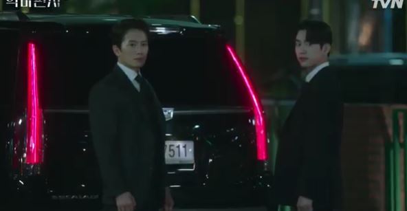 Min watches as an SUV pulls up next to Ga-on and Yo Han climbs out of it. Yo Han and Ga-on look at Min before going way in Yo Han’s SUV.