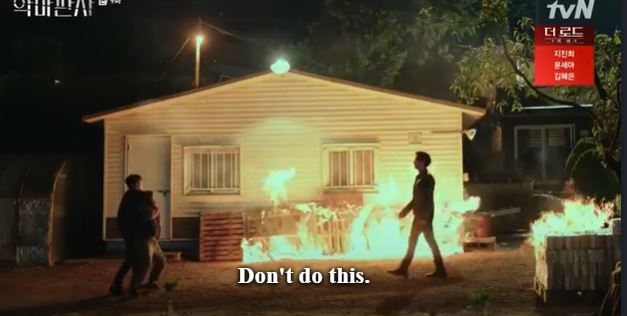 Doh runs on all fours towards Yo Han but Yo Han kicks him. He tells Ga-on to hold Doh back and Ga-on complies. Yo Han pours gasoline over the money pile. Doh screams asking him not to touch the money. He pours gasoline over the workshop too. Yo Han says he is giving Doh Young Choon an opportunity. Ga-on tells him not to do it. Yo han lights the money pile on fire and then sets the workshop on fire too.