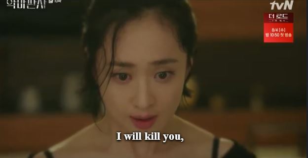 She pushes the glassware from the table in rage. She walks around in fury and finally declares, “I will kill you Kang Yo Han and tear you to shreds.”