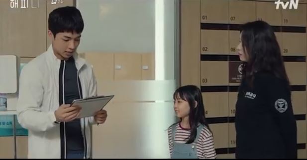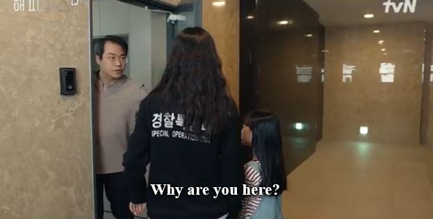 Sae Bom kicks down the door to the 6th floor saying that it is illegal to block the fire exit. The girl’s eyes widen in admiration. She says bye to the girl (Park Seo Yoon).