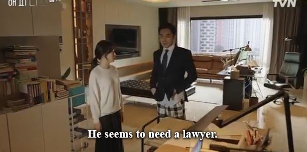 She goes over to apartment 602. A busy attorney on the phone opens the door. He takes the rice cake and hands over his business card to Sae Bom. Sae Bom learns that the attorney’s name is Kook Hae-Sung (Park Hyoung-Soo). He says he will do free consultations for her as she is his neighbour.