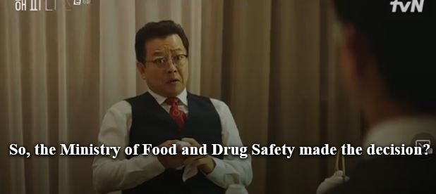 Han gets up as Chairman Seok joins him. Seok picks up the soup bowl and gulps down the entire contents at one go. Seok asks if the Food and Drug safety have made the decision. Han says they will announce it tomorrow under the condition that NEXT has to be prescribed to only adult ADHD patients (Attention deficit hyperactivity disorder- Children with ADHD may have trouble paying attention, controlling impulsive behaviours (may act without thinking about what the result will be), or be overly active.). He says they will expand the age group when the drug proves effective. Seok thanks Han for helping him get richer.