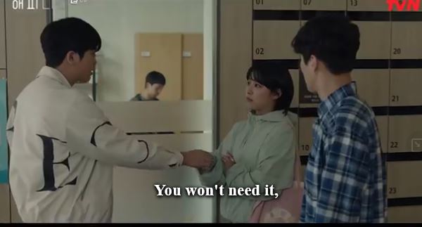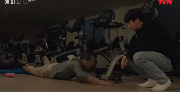 Sang-Hee says Min-Ji used to take supplement pills if she got tired. She says Min-Ji got the from the gym. Oh realises that the gym trainers have been supplying the pills. He says he has to check something and goes out.