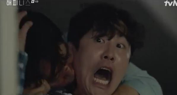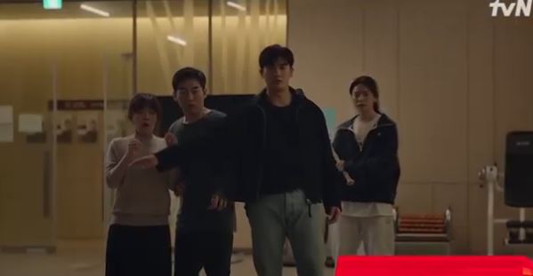Na gets a grip on herself and runs into the gym. She brings a chair and blocks the door. Seung Beom gets up and the water spills from the tumbler as he knocks it down. He asks Na what is happening. Na looks at him in fear.