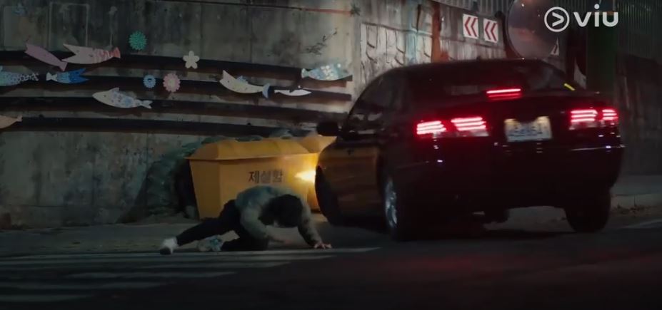 Just then, another car comes from the end of the road and it seems to have lost control. Hee Woo pushes his parents to the other side and he jumps the other way as the car comes right at them.