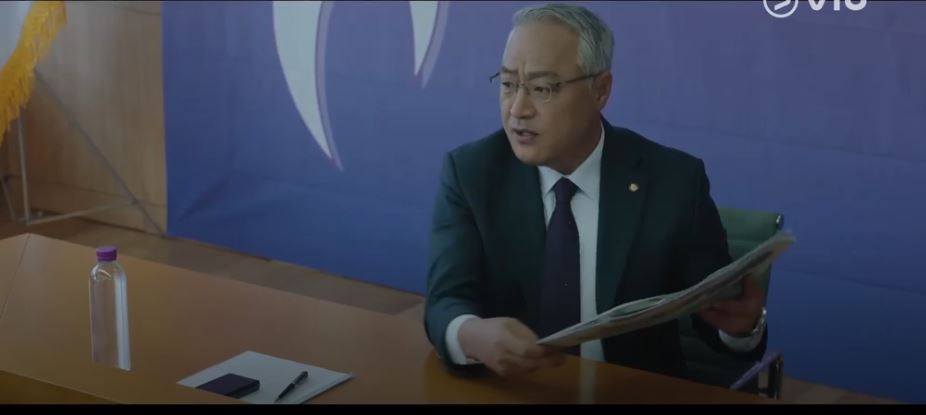 An irate Jo Tae Seob (Lee Kyoung-Young )is at the Minguk Party Meeting. He is told that Assemblyman Yoon (the President’s father in law) and others are opposing the idea.