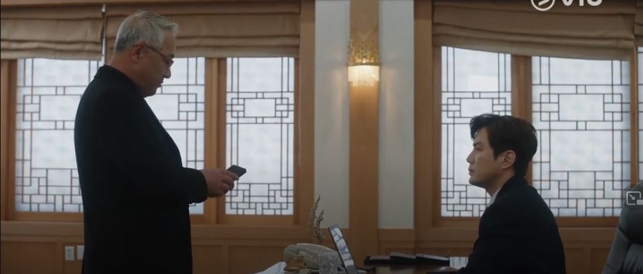 Jo goes over to the Blue House and meets with President Jae Geun. Jo gives the President an earful for siding with his father in law. He replays a video (spycam video) on his phone as Jae Geun watches. In the video, Jo offers to give more funds to Jae Grun’s presidential campaign and Jae Geun says he will not forget this favour. Jo says all he wants is one of his people to be in the Presidential office.