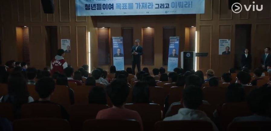 Jo starts interacting with the students earning applause from the audience except for Hee Woo. Hee Woo watches Jo make promises to the students. Jo tells them to set goals based on their dream and the future will belong to them.