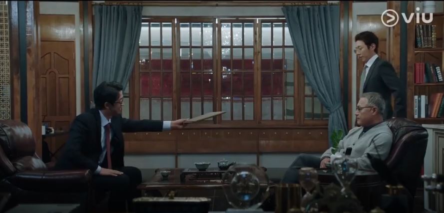 After Kim leaves, Min Soo and Hee Woo walk in. Min Soo asks where the is the thing he asked for. Moon takes out a pen that has the full recording of the conversation between Kim and himself. Min Soo passes it to Hee Woo. Moon says it was Min Soo’s idea to record.