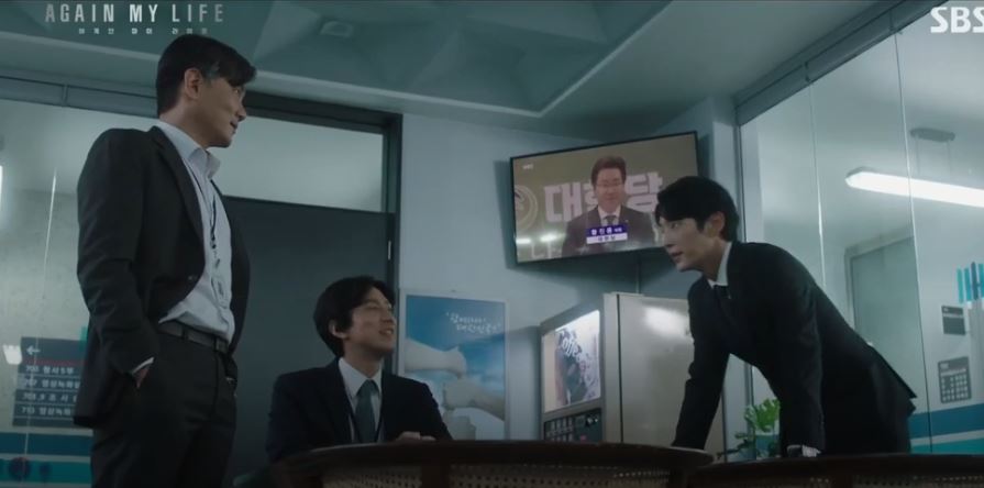 Hee Woo clicks the button underneath the table and the camera stops recording. Hee Woo plays a recording from his phone. It has Joon’s statement which says Kim Seok Hoon asked Assemblyman Gu’s name to be left out of the Press brief. Hee Woo says he is also a witness to this.