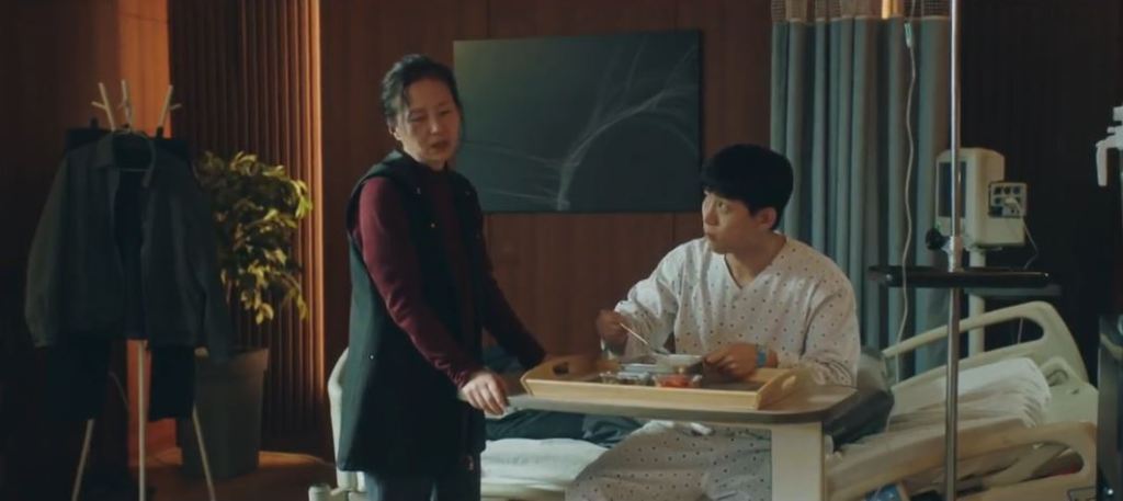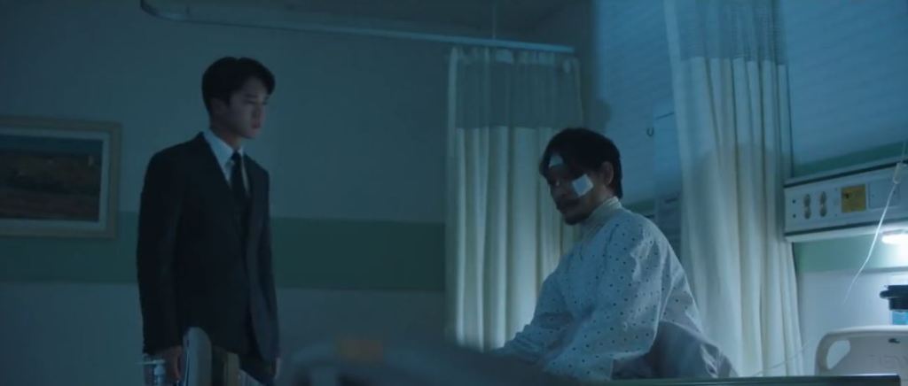 At the hospital, a woman wearing a facemask distracts the guard as Jung Man Chun’s son Won Woong sneaks inside his hospital room.