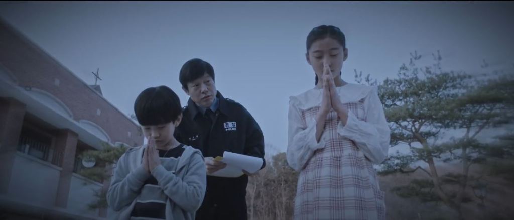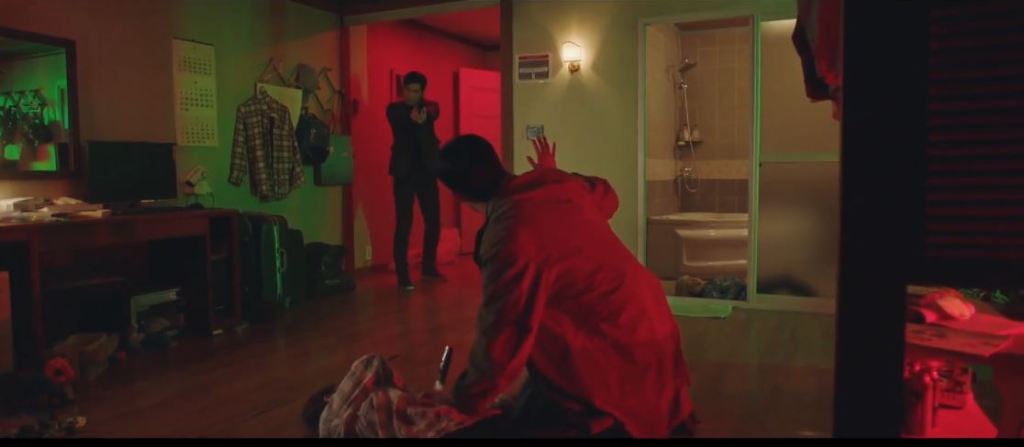 Kang locates Sung Jun’s phone and comes to the motel. He finds a room with its door ajar. He goes inside and is shocked to find Sung-Jun over Jung’s wife’s body gripping the knife that is plunged into her. Kang points the gun at Sung Jun who removes his hand from the knife and tries to explain.