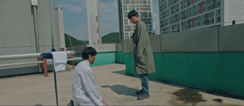 Sung Jun goes to the roof of the hospital where the police officer waits along with Jung Man Chun. Jung says he wants to speak to Sung-Jun alone. The officer says he can’t allow that. Sung Jun says it is fine and the officer walks away.
