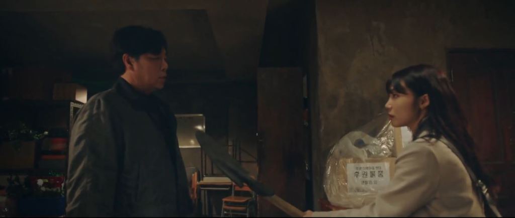 Eun Ki gives Sung Jun some food. She says they are in a storage room in the backyard of the Children’s Centre. She tells him that no one comes here but tells him to avoid going outside. She says the employees and the children come at 9 am and leave at 6 pm during the weekdays.