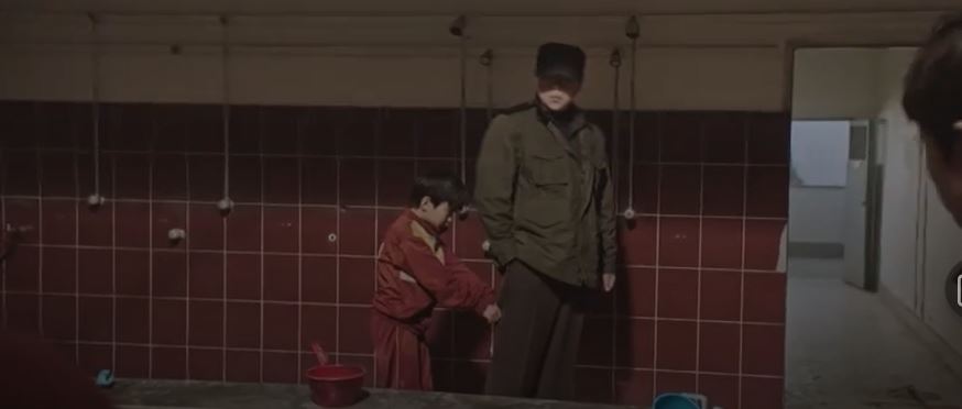 Sergeant Choi (Juror and taxi driver) grabs 7 and stuffs his face in the dirty water. Yoon Jae watches this silently. Choi tells 7 to stick out his tongue and clean everything with his tongue. He beats up the boy when he refuses. He stamps the boy’s wrist hard. 24 starts walking towards him but 11 stops him. Yoon Jae seems angry but he keeps quiet.