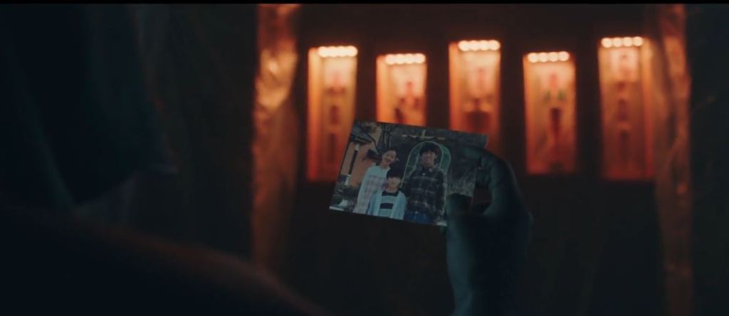The black figure sits in its hideout. It watches the photograph of Yoon Jung, 11 and Yoon Jae. All three of them are wearing the same necklace.