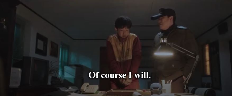 Choi hears a knock and calls the person in. He laughs saying he thought it was him and he was right. Choi says he noticed ‘him’ recognize Crazy Dog in the courtroom. He says he knew he was number 7 from the burn scar on his left hand. He says he knew 7 was there that day.