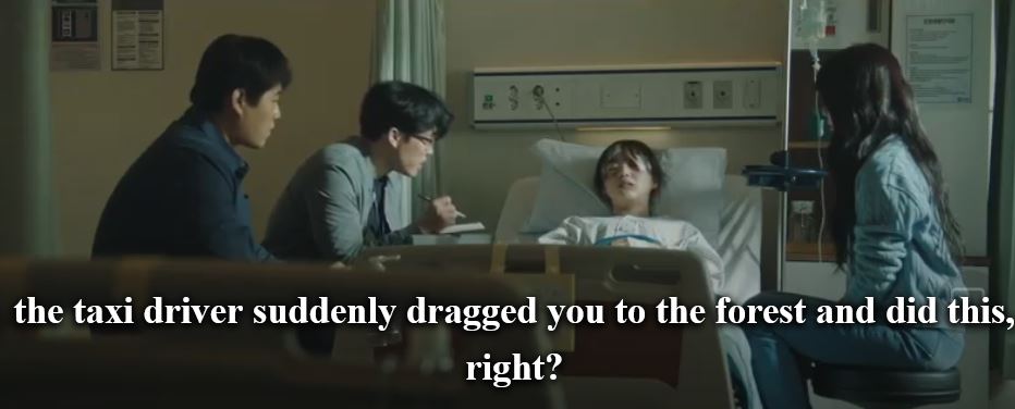 Later, Yu Na is in the hospital. She tells the detectives that she was drunk and she can’t remember the driver’s face but she remembers the tattoo he had on his arm.