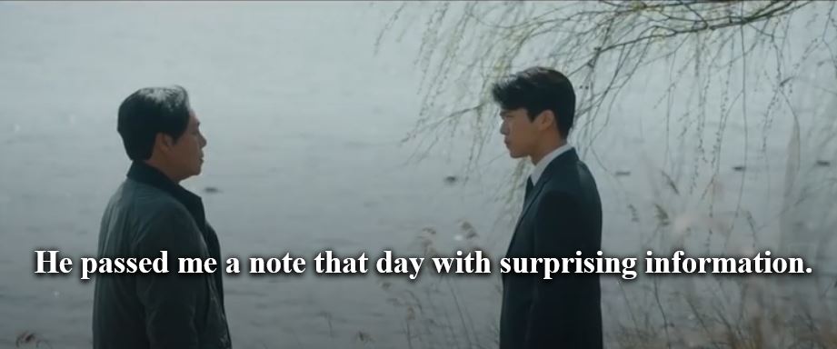 Sung Hoon reads the note in the restroom. Kim enters the restroom. Sung Hoon hands him the note. He says he wants to meet Sung Jun and then he will know who the real culprit is.