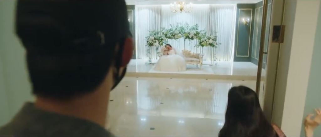 Meanwhile, there is a commotion in the bride’s room. Sung Jun walks up to them and peeks inside. The bride Ha-Na sits motionless on the couch. Her wedding dress is stained with blood. Her cheeks are slit.