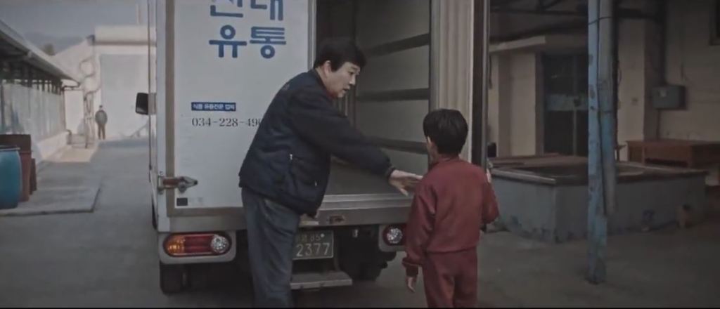 The man finds Yoon Jae (13) by the delivery truck. He tells the boy to move away and gets into the truck. He takes a choco pie and hands it to Yoon Jae. He asks Yoon Jae for his name. Yoon Jae says 13.