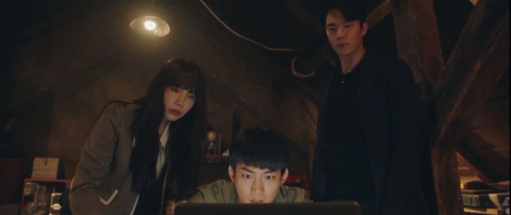 Sung Hoon says the killer is confident he will win the game and that is why he is live streaming it. He says the killer would’ve diverted the IP address. Just then, Eun Ki listens closer and draws attention to a clock bell in the background.