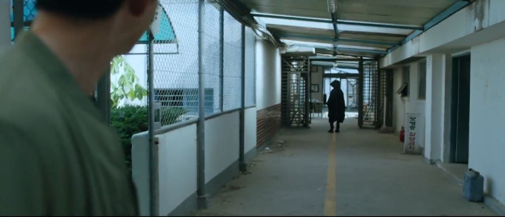 Sung Jun enters the building. He looks to the side and sees the black figure looking at him. It turns around and walks away. Sung Jun follows it into a corridor but loses it.