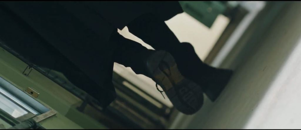 Sung Jun loses his footing and falls. His hands are smeared with blood. Sung Jun notices a yellow paint patch on the sole of the figure’s shoes as the figure walks away from him. Sung Jun passes out.