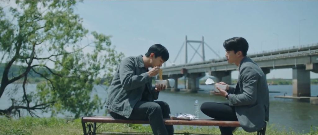 The brothers stop by the bridge for lunch. Sung Hoon comments that Sung-Jun doesn’t find the situation hard. Sung Jun says he gets to eat with his brother. He says Sung Hoon used to make salty ramyeon for him. He complains that they ate only ramyeon. Sung Hoon says he spent all their lunch money on settling with the kids that Sung-Jun beat up. He implies that Sung Jun is ungrateful.
